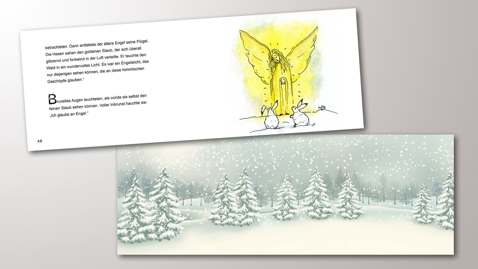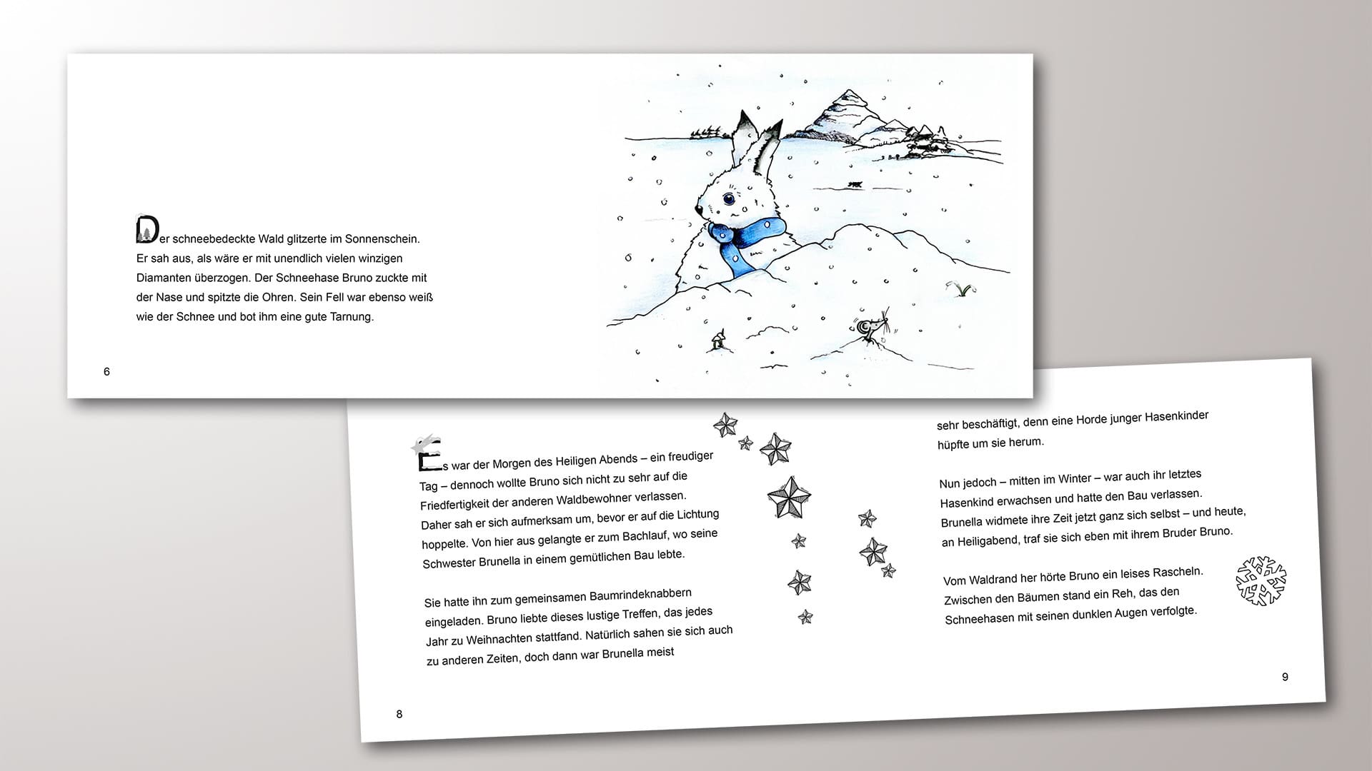 Die herzerwärmende Geschichte von Bruno, dem Schneehasen und seiner Schwester Brunella verdiente schon seit längerem ein frisches Gewand. Als die Autorin sich entschloss, das bereits vorher als Broschur erschienene Büchlein in einer wertigen Hardcoverversion herauszugeben und den Buchblock aufwändiger und schöner zu gestalten, durfte ich sie dabei unterstützen.