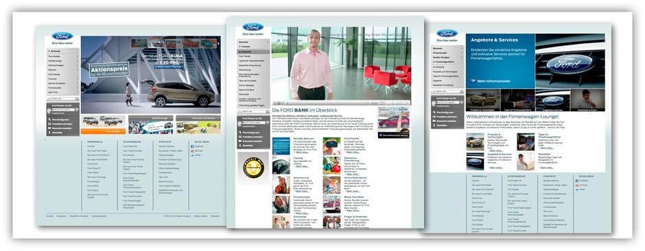 Im Rahmen meiner Festanstellung bei der Wunderman GmbH, die die Ford Werke Köln bereits seit den 50er Jahren betreut, textete ich unter anderem auch für die Website ford.de. Ein Schwerpunkt war der Relaunch der Site im Jahr 2010.