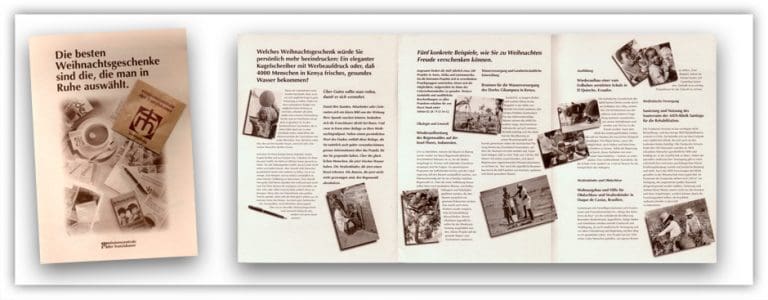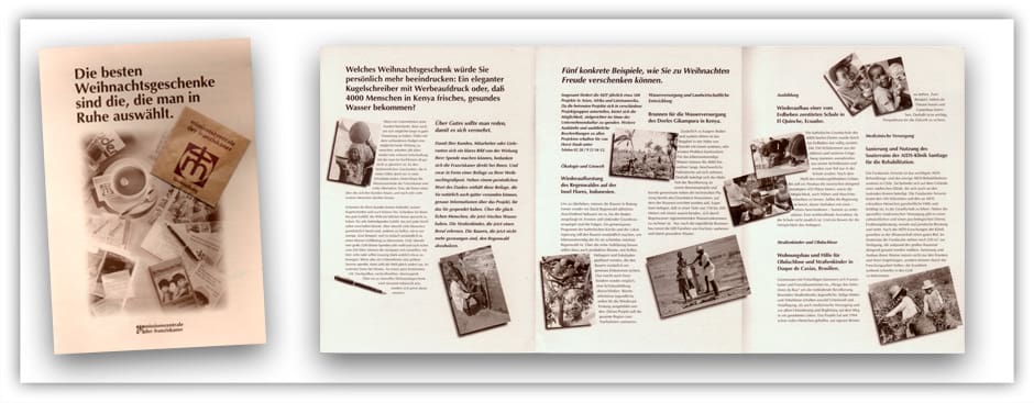 Hin und wieder an karitativen Projekten zu arbeiten, ist erfrischend und erweitert den Horizont. Man arbeitet ja schließlich nur kostenlos, aber nicht umsonst. Erst recht nicht, wenn ein Mailing wesentlich mehr Spendengelder einbringt, als der Auftraggeber es bis dato gewohnt war. Wie dieses Weihnachtsmailing für den Orden der Franziskaner während meiner Festanstellung bei der B/W Werbeagentur.