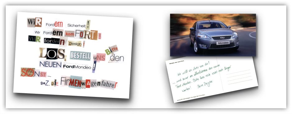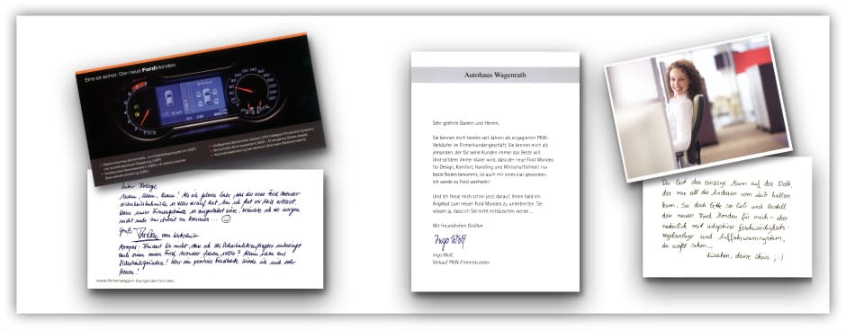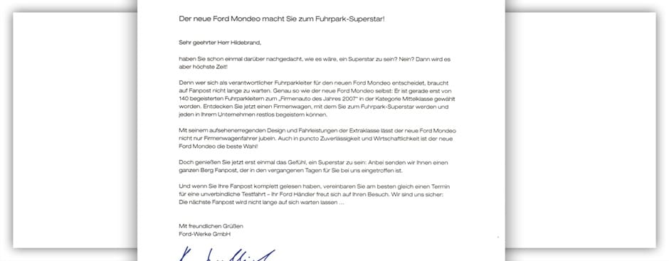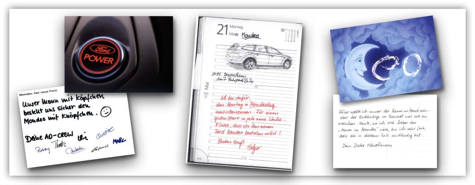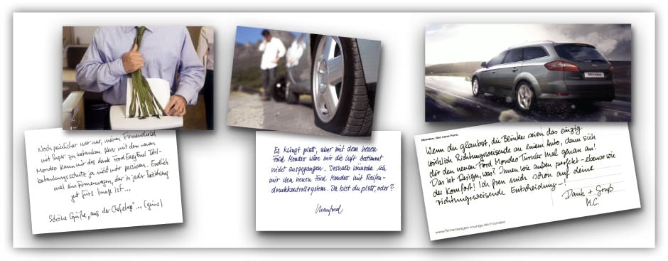 Gleich waschkörbeweise (in der „Breitenversion“ dann großbriefumschlagweise) erhielten die Fuhrparkentscheider Fanpost von ihren Firmenwagenfahrern, die sich in vielerlei Form lobend über den neuen Ford Mondeo äußerten und sich persönlich bei ihrem Fuhrparkleiter bedankten.