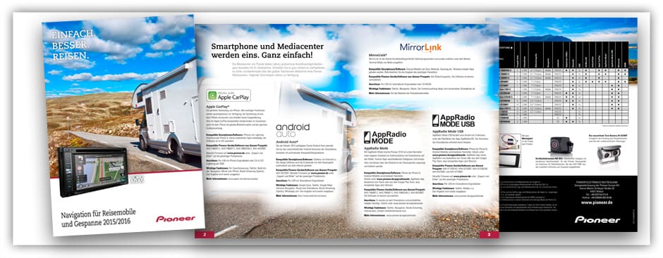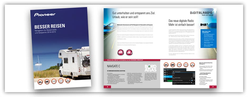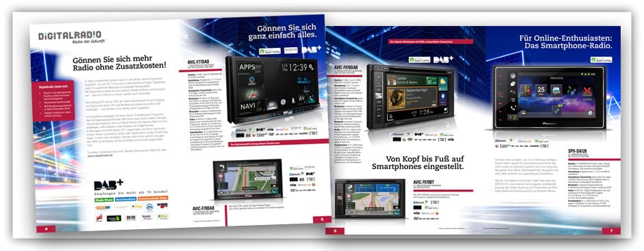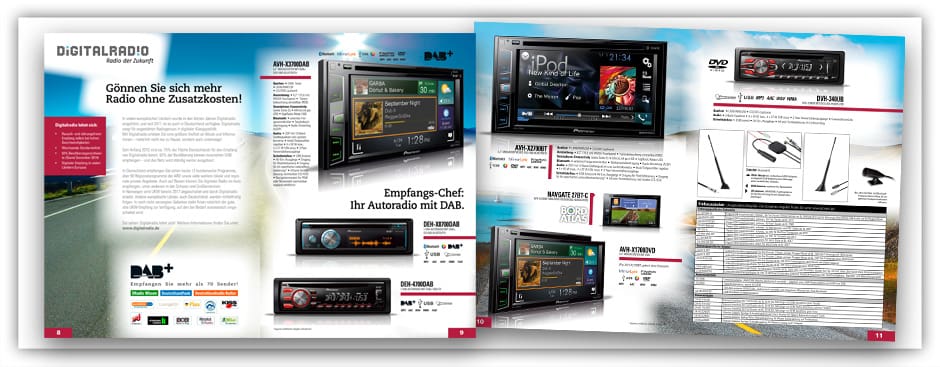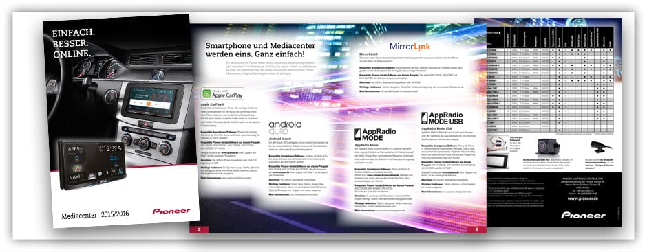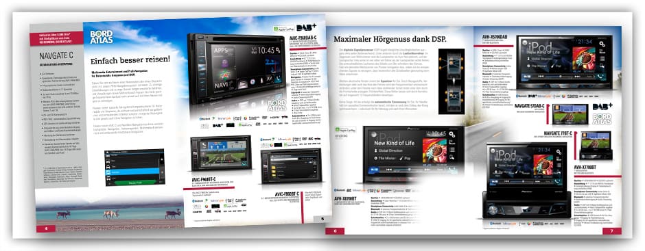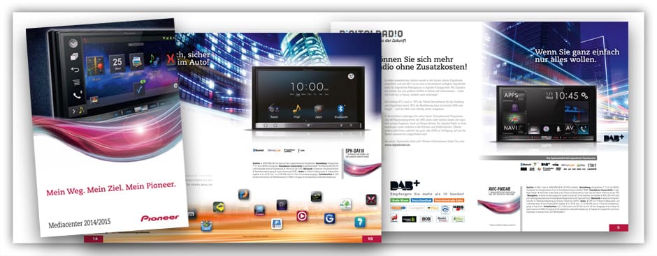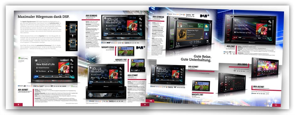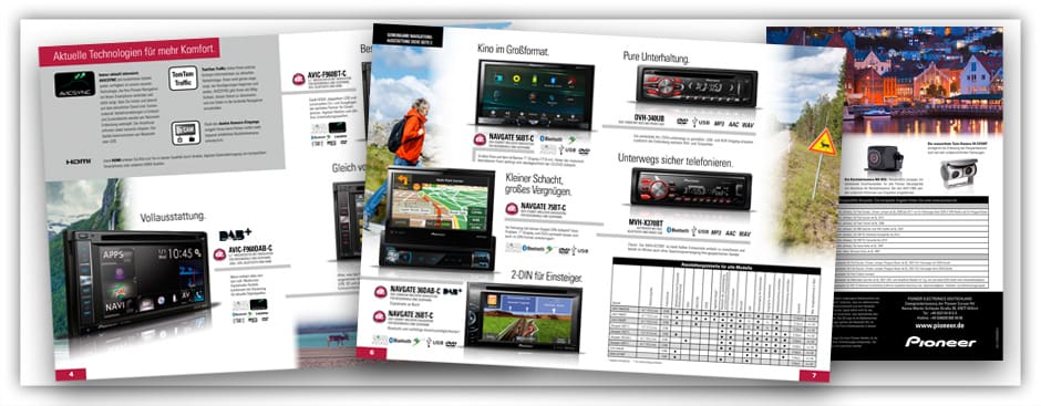 Neben dem jährlich erscheinenden „Car Entertainment Guide“, dem gesamteuropäisch produzierten Car Audio Gesamtkatalog, benötigt die Pioneer Electronics (Deutschland) GmbH in Willich immer wieder spezielle Druckwerke für den deutschen Markt, die ich immer wieder gerne liefere.